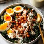 A vibrant and nutrient-packed Chicken Kale Salad featuring softened Tuscan kale, roasted burst tomatoes, crispy seasoned chickpeas, shredded cooked chicken, and soft boiled eggs, all tossed in a creamy Parmesan tahini dressing. This salad combines varied textures and robust flavors, making it a perfect wholesome meal for lunch or dinner.