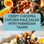 Keywords: Chicken Kale Salad, Roasted Tomatoes, Crispy Chickpeas, Tahini Dressing, Healthy Salad, Mediterranean Salad