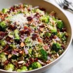 This vibrant Broccoli Pearl Crunch Salad combines tender-crisp marinated broccoli with pearl couscous, sweet dried cranberries, savory salami, crunchy almonds, and a bright, tangy red wine vinaigrette. Tossed with grated parmesan, this salad offers a perfect balance of textures and flavors, ideal for a light lunch or a refreshing side dish.