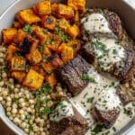 This Butternut Squash & Garlic Herb Steak Bowl is a hearty and flavorful meal that combines roasted butternut squash with a perfectly seared herb-seasoned steak. The dish features tender cubes of roasted squash infused with olive oil, salt, and pepper, paired with a garlic, rosemary, and thyme seasoned sirloin or ribeye steak seared to your preferred doneness. It’s an easy yet elegant bowl perfect for a nutritious dinner loaded with wholesome ingredients and vibrant flavors.