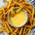 A light gray bowl filled with creamy yellow cheese sauce peppered with black specks sits in the middle of the image, surrounded by a thick layer of golden, crispy French fries seasoned with specks of black pepper and some darker browned edges; three fries dip into the sauce from the bowl. The bowl is placed on white parchment paper over a white marbled surface, and there is a piece of fabric with blue and white stripes partially visible on the right side. photo taken with an iphone --ar 4:5 --v 7