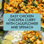 This Chicken and Chickpea Curry is a flavorful and hearty dish combining tender chicken, creamy coconut milk, and nutrient-rich chickpeas with vibrant spices like curry powder and turmeric. Cooked on the stovetop, it includes wholesome vegetables like bell peppers, cauliflower, and spinach, making it a balanced and satisfying meal perfect for serving over steamed rice.