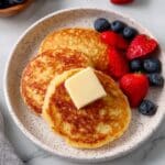 A white speckled bowl holds three thick, golden brown pancakes stacked unevenly, each with a crispy, textured surface showing a mix of light and darker browns. On top of the stack is a small square of pale yellow butter melting slightly. Around the pancakes, there are fresh blueberries with a deep blue color and one bright red strawberry with green leaves, all resting inside the bowl. The bowl is placed on a soft gray cloth, and the background is a white marbled texture. Photo taken with an iphone --ar 4:5 --v 7
