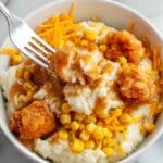 6. Assemble the Bowl: On top of each bowl of mashed potatoes, layer the baked popcorn chicken, heated corn, warm gravy, and finish with a generous sprinkle of shredded cheddar cheese.