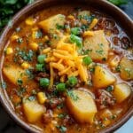 This Creamy Chorizo Potato Soup combines spicy chorizo with tender Yukon gold potatoes in a rich, smoky broth enhanced by smoked paprika and thyme. Blended to a smooth or slightly chunky texture and finished with sweet corn and creamy heavy cream, this comforting soup is perfect for a hearty meal. Garnished with green onions, cheddar cheese, and fresh parsley, it offers layers of flavor and satisfying warmth.