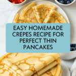 This classic crepe recipe yields thin, delicate pancakes perfect for sweet or savory toppings. Made with simple ingredients like milk, eggs, butter, and flour, the batter is blended for smoothness and refrigerated for at least 30 minutes to ensure tender, thin crepes that cook quickly in a skillet to a light golden brown.