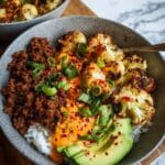 These Crispy Chile Ground Beef and Cauliflower Protein Bowls are a flavorful, high-protein meal perfect for busy weeknights. Combining spicy, seasoned beef with tender cauliflower rice and fresh veggies, they deliver a satisfying and vibrant bowl that’s both nutritious and delicious.