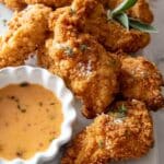 The image shows several pieces of golden brown, crispy fried chicken tenders with a rough textured coating, arranged closely around a small white scalloped bowl filled with a light orange dipping sauce speckled with herbs. One chicken tender is partially dipped in the sauce. There are a few coarse salt flakes sprinkled on the chicken and some small fresh green herb leaves placed among the tenders. The background is a white marbled surface that softly contrasts with the warm colors of the food. photo taken with an iphone --ar 4:5 --v 7