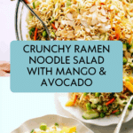 Keywords: Ramen noodle salad, crunchy salad, coleslaw mix salad, sesame honey vinaigrette, toasted almonds, avocado salad, mango salad, Asian inspired salad