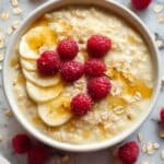 This creamy Custard Oatmeal is a comforting breakfast dish made by slowly cooking rolled oats with milk and then enriching it with a smooth custard mixture of egg, honey, and vanilla. Topped with fresh berries, sliced bananas, and chopped nuts, it offers a deliciously textured start to your day.