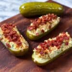 4. Add Toppings: Sprinkle the crumbled crispy bacon evenly over the filled pickle boats. Garnish with additional chopped fresh dill, chives, or a light sprinkle of smoked paprika if desired.