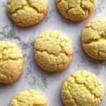 The image shows several round, soft cookies with a rough, crumbly texture and light golden-yellow color. One cookie is placed close to the camera, showing detailed cracks on the surface that reveal a soft inner texture. The cookies are laid out on a white marbled textured surface. The background includes more cookies, slightly blurred, emphasizing the focus on the front cookie. Photo taken with an iphone --ar 4:5 --v 7