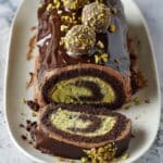 A chocolate roll cake is sliced and placed on a white oval plate with a white marbled surface in the background. The cake has three visible layers: the dark chocolate sponge cake forms the outer swirl, the light green pistachio filling is rolled inside, and a smooth light brown chocolate cream covers the outside. On top, there is a thick layer of shiny dark chocolate glaze dripping slightly down the sides. Four round pistachio-coated truffles are placed on top and along the side of the cake, with crushed pistachios sprinkled around them. The texture looks moist and rich, with crumbs scattered at the edges. Photo taken with an iphone --ar 4:5 --v 7