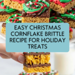 Easy Christmas Cornflake Brittle is a festive, crunchy treat perfect for the holiday season. This no-fuss recipe combines crispy cornflakes coated in a buttery brown sugar glaze, baked to golden perfection, then topped with melted chocolate almond bark and colorful red and green candy melts. Sprinkled with optional Christmas-themed decorations, this brittle is both delicious and visually appealing, making it a perfect holiday gift or party snack.