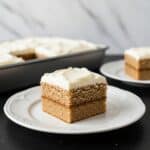 Store the frosted pumpkin cake in an airtight container in the refrigerator for up to 4 days. Before serving, let individual slices come to room temperature for the best texture. You can also freeze the unfrosted cake for up to 2 months; thaw fully before frosting and serving.