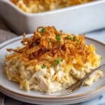 A white plate on a white marbled surface holds a single serving of creamy casserole with three visible layers. The bottom layer is composed of tender white chicken pieces mixed with soft, yellow-beige orzo pasta. The middle layer is a thick, smooth cream sauce that coats the chicken and orzo, giving a glossy texture. The top layer features a golden-brown pile of crispy fried onions scattered unevenly, sprinkled with small bits of green herbs for color contrast. A fork rests on the right side of the plate, partially embedded in the casserole. In the background, a white casserole dish filled with more of the same dish is blurred out. photo taken with an iphone --ar 4:5 --v 7