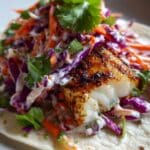 - Assemble the Tacos: Break the grilled fish into chunks and distribute evenly among the tortillas. Top each taco with a generous scoop of chipotle slaw.