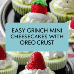 Keywords: Grinch Mini Cheesecakes, Oreo crust cheesecake, holiday desserts, Christmas treats, mini cheesecakes, festive green cheesecake