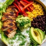Keywords: High protein chicken, fajita bowl, meal prep, healthy dinner, Tex-Mex chicken, brown rice bowl, sautéed vegetables