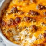 The dish is a close-up view of a cheesy casserole in a white oval baking dish set on a white marbled surface. The top layer is golden orange melted cheddar cheese with crispy browned spots, covering several irregularly shaped brown sausage pieces that peek through. Below the cheese and sausage, there is a creamy white layer that looks soft and mixed with bits of sausage, creating a rich, gooey texture. The layers blend together with a mix of smooth melted cheese, browned sausage chunks, and creamy white filling in a slightly uneven but appetizing surface. Photo taken with an iphone --ar 4:5 --v 7