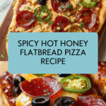This Delicious Hot Honey Flatbread Pizza combines the sweetness of honey with the spicy kick of hot sauce and chili flakes, layered over garlic-infused flatbreads with tomato sauce, mozzarella cheese, pepperoni, olives, and jalapeños. It delivers a perfect balance of sweet, spicy, and savory flavors baked to golden perfection with a crispy flatbread base.