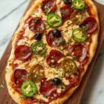 This Delicious Hot Honey Flatbread Pizza combines the sweetness of honey with the spicy kick of hot sauce and chili flakes, layered over garlic-infused flatbreads with tomato sauce, mozzarella cheese, pepperoni, olives, and jalapeños. It delivers a perfect balance of sweet, spicy, and savory flavors baked to golden perfection with a crispy flatbread base.