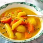 This traditional Jamaican Pumpkin Soup is a hearty, creamy, and flavorful dish featuring pumpkin, yam, chocho, and rich spices simmered in a savory vegetable broth with coconut milk. It includes homemade dumplings that absorb the aromatic flavors, delivering a comforting Caribbean experience perfect for any season.