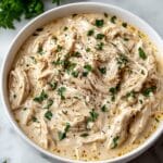 The image shows a white bowl filled with creamy shredded chicken in a thick, light beige sauce. The chicken pieces are tender and mixed smoothly with the sauce, creating a uniform layer that covers the entire bowl. On top, there are small chopped green parsley leaves scattered evenly, along with a sprinkle of ground black pepper adding texture and color contrast. The bowl sits on a white marbled surface, and in the background, some fresh green parsley leaves are slightly blurred. photo taken with an iphone --ar 4:5 --v 7