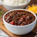 - Step 6: Serve the chili hot over white rice with optional toppings like shredded cheddar cheese and diced green or white onions. Enjoy!