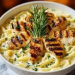 A white bowl filled with a creamy, light yellow sauce base covering a layer of soft, thick noodles, topped with six pieces of grilled chicken each displaying golden brown grill marks and a slightly crispy texture. The chicken pieces are scattered evenly across the noodles, sprinkled lightly with chopped green herbs. A fresh sprig of rosemary with dark green needles lies diagonally on top, adding a fresh touch to the dish. The bowl is placed on a white marbled surface with a blurred background in warm tones. photo taken with an iphone --ar 4:5 --v 7