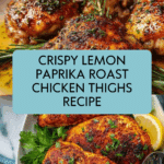 This Lemon Paprika Roast Chicken Thighs recipe features juicy bone-in, skin-on chicken thighs marinated in a vibrant blend of fresh lemon juice, smoked paprika, garlic, olive oil, and basic seasonings. Roasted to crispy golden perfection, this dish strikes a beautiful balance of smoky, tangy, and savory flavors while remaining simple and quick to prepare. Garnished with fresh herbs and lemon wedges, it makes a rustic yet elegant main course perfect for weeknight dinners or gatherings.