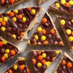 Keywords: peanut butter cup bark, Reese’s Pieces bark, no bake chocolate peanut butter dessert, layered chocolate bark, easy holiday dessert