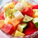 A refreshing and zesty Mexican Fruit Salad featuring a vibrant mix of watermelon, cantaloupe, mango, pineapple, cucumber, and jícama, all tossed with fresh lime juice and the spicy, tangy kick of Tajin seasoning. Perfect for a healthy snack or side dish during warm weather.