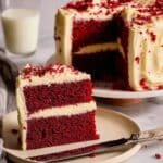 A rich red velvet cake with two thick layers of deep red sponge separated by a smooth, creamy off-white frosting layer. The entire cake is covered in the same creamy frosting with small red crumbs sprinkled on top. One thick slice is cut and placed slightly behind the main cake on a white plate, showing two more layers of red sponge and white frosting. The cake sits on a round beige plate with a knife resting next to it. In the background, there is a glass of milk on a white marbled surface. Photo taken with an iphone --ar 4:5 --v 7