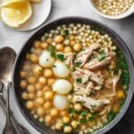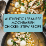 Keywords: Moghrabieh, Lebanese pearl couscous, chicken stew, pearl onions, chickpeas, Middle Eastern recipe, comfort food