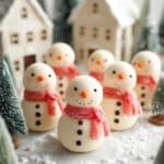 - Add Scarves: Cut strawberry lace sweets or candy pencils to size and wrap them around the snowmen’s necks. Use a dab of melted white chocolate if needed to secure the scarves in place.