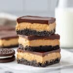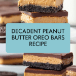 Delicious Peanut Butter Oreo Bars featuring a crunchy Oreo cookie crust, a creamy peanut butter layer, and a smooth chocolate topping. These no-bake bars combine classic flavors for a rich and satisfying treat perfect for any occasion.