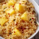 This Pineapple Rice recipe is a flavorful and vibrant dish combining the sweetness of pineapple with aromatic garlic, ginger, and a hint of heat from sriracha and red chili flakes. Toasted jasmine or basmati rice is cooked with this delicious mixture to create a fragrant and satisfying side or main dish perfect for any meal.