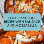 This hearty Pizza Soup combines classic pizza flavors into a comforting bowl of soup. Featuring Italian sausage, pepperoni, crushed tomatoes, and fresh basil, topped with melted mozzarella cheese, it’s a perfect rich and savory dish that’s easy to prepare on the stovetop. The soup simmers with aromatic herbs and spices, creating a delicious meal reminiscent of a favorite pizza, served as a cozy soup.