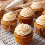 Store pumpkin cupcakes in an airtight container in the refrigerator for up to 4 days. Allow refrigerated cupcakes to come to room temperature before serving for the best texture. Leftover frosting can be refrigerated and brought back to room temperature before re-whipping if needed.