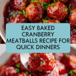 Quick Cranberry Meatballs feature tender pork meatballs baked to perfection and coated in a tangy-sweet cranberry sauce. This easy-to-make appetizer or main dish combines savory flavors with festive cranberry sauce, ideal for gatherings or weeknight dinners.