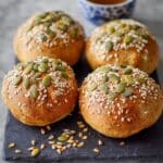 Four small round brown bread rolls topped with a mix of green pumpkin seeds and light beige sunflower seeds are placed on a dark slate board. One roll is cut in half horizontally, showing a soft, airy, and light brown inner texture with small air holes. The bread surface is smooth with a slightly cracked crust. Scattered seeds fall on the black board and the surrounding white marbled surface. In the background, there is a small white bowl with a blue interior containing a spread or dip. photo taken with an iphone --ar 4:5 --v 7