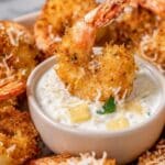 The image shows a close-up of fried shrimp with a golden-brown, crunchy breadcrumb coating arranged around a white bowl filled with a creamy white dipping sauce that has visible small bits of pineapple and shredded coconut on top. One piece of shrimp is dipped halfway into the sauce, showing its curved shape and textured crust with a few green herb leaves. The bowl sits on a white marbled surface, and the shrimp pieces are scattered closely around it in a casual, appetizing pile. photo taken with an iphone --ar 4:5 --v 7