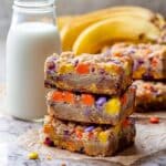 A stack of three thick slices of colorful candy cookie bars sits on a piece of parchment paper on a white marbled surface. Each slice has visible layers of dough with bright orange, yellow, and purple candy pieces embedded in the crumbly texture. Behind the stack, there are more slices laid flat, and a glass bottle filled with milk is positioned to the left. In the background, whole yellow bananas rest on the white marbled surface. The lighting is natural, highlighting the rough texture of the cookie bars and the smooth milk bottle, photo taken with an iphone --ar 4:5 --v 7