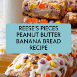 Keywords: peanut butter banana bread, Reese’s Pieces banana bread, peanut butter glaze, sweet bread, dessert bread, easy banana bread, candy banana bread