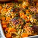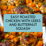 Keywords: roasted chicken, butternut squash bake, leek recipe, one pan dinner, chicken thighs, comforting dinner, fall recipe, easy dinner
