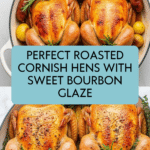 Keywords: Cornish hens, roasted Cornish hens, bourbon glaze, honey glaze, holiday recipe, roasted poultry, elegant dinner, game hen recipe