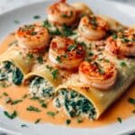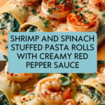 This Shrimp and Spinach Stuffed Pasta Rolls dish combines tender jumbo shells filled with a creamy blend of shrimp, spinach, and cheeses, all topped with a luscious roasted red pepper cream sauce. It’s a perfect meal for a comforting dinner that feels special yet is simple to prepare.