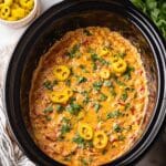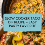 Keywords: slow cooker taco dip, taco dip recipe, party appetizer, game day dip, layered dip, Mexican dip
