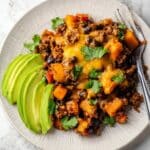 This Southwestern Ground Beef Sweet Potato Skillet is a flavorful and hearty one-pan meal featuring lean ground beef, sweet potatoes, and black beans, seasoned with a blend of southwestern spices. It’s a comforting and nutritious dish perfect for weeknight dinners, offering a delicious mix of savory and slightly spicy flavors with a creamy melted cheese topping.